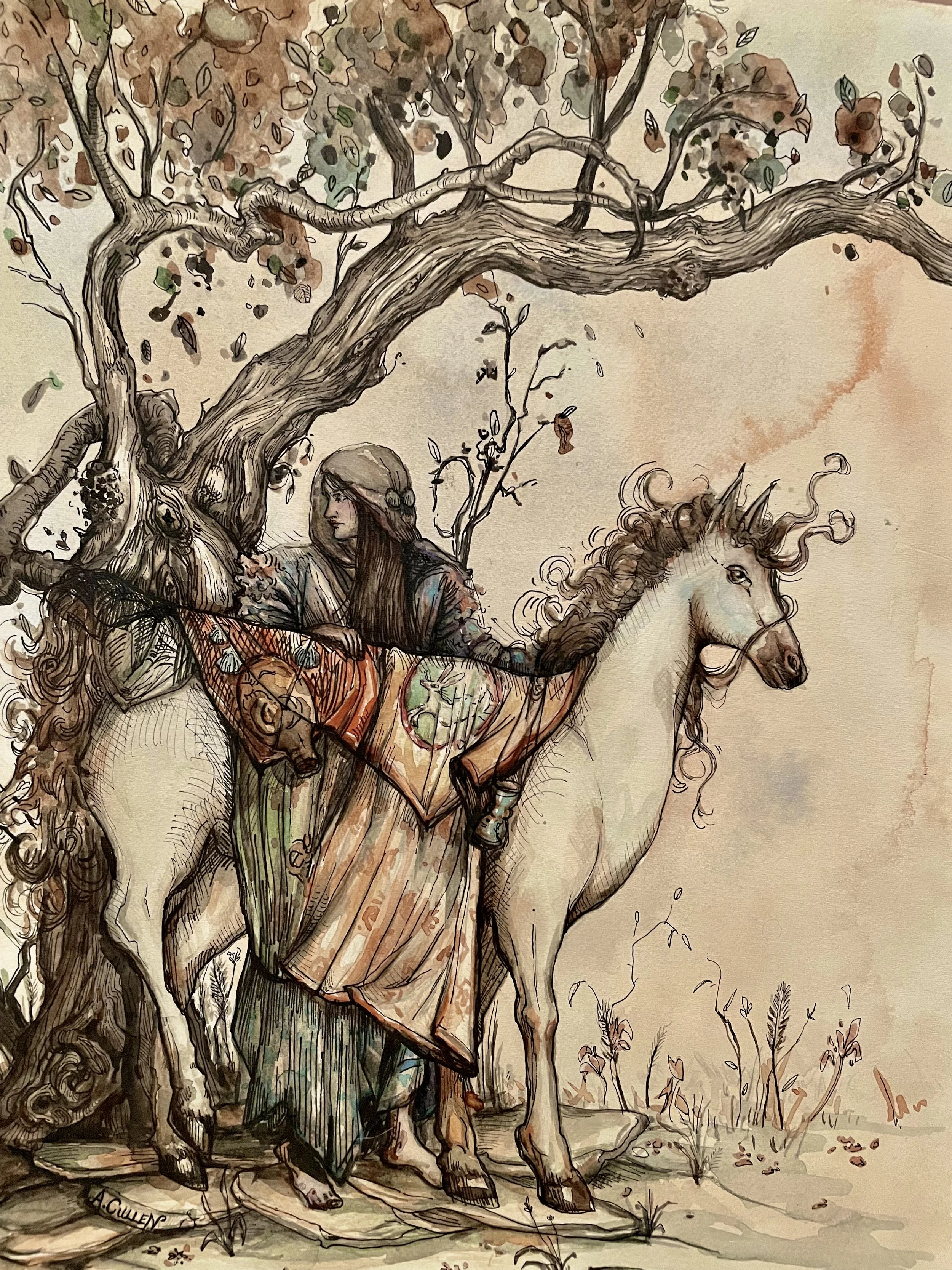 Originally from the UK, Ashley Cullen (b. 1998) is an artist based in Canberra ACT. Growing up in a large family, Cullen has always been fascinated with describing those close to her through sketching and painting. After finishing college and winning the John Cope Award for Academic Excellence, Cullen would go on to pursue her love of painting at the Australian National University, specialising in visual art and literature. In her final year of university she graduated with the ANU School of Art & Design EASS Belconnen Arts Centre Exhibition Award and the Eckersley’s Art & Craft Materials Award. Ashley's illustrations here are partly an homage to English artist Arthur Rackham who, by the early 1900s, had developed a considerable reputation for his pen, ink and watercolour fantasy illustrations, often specialising in fairy tales.